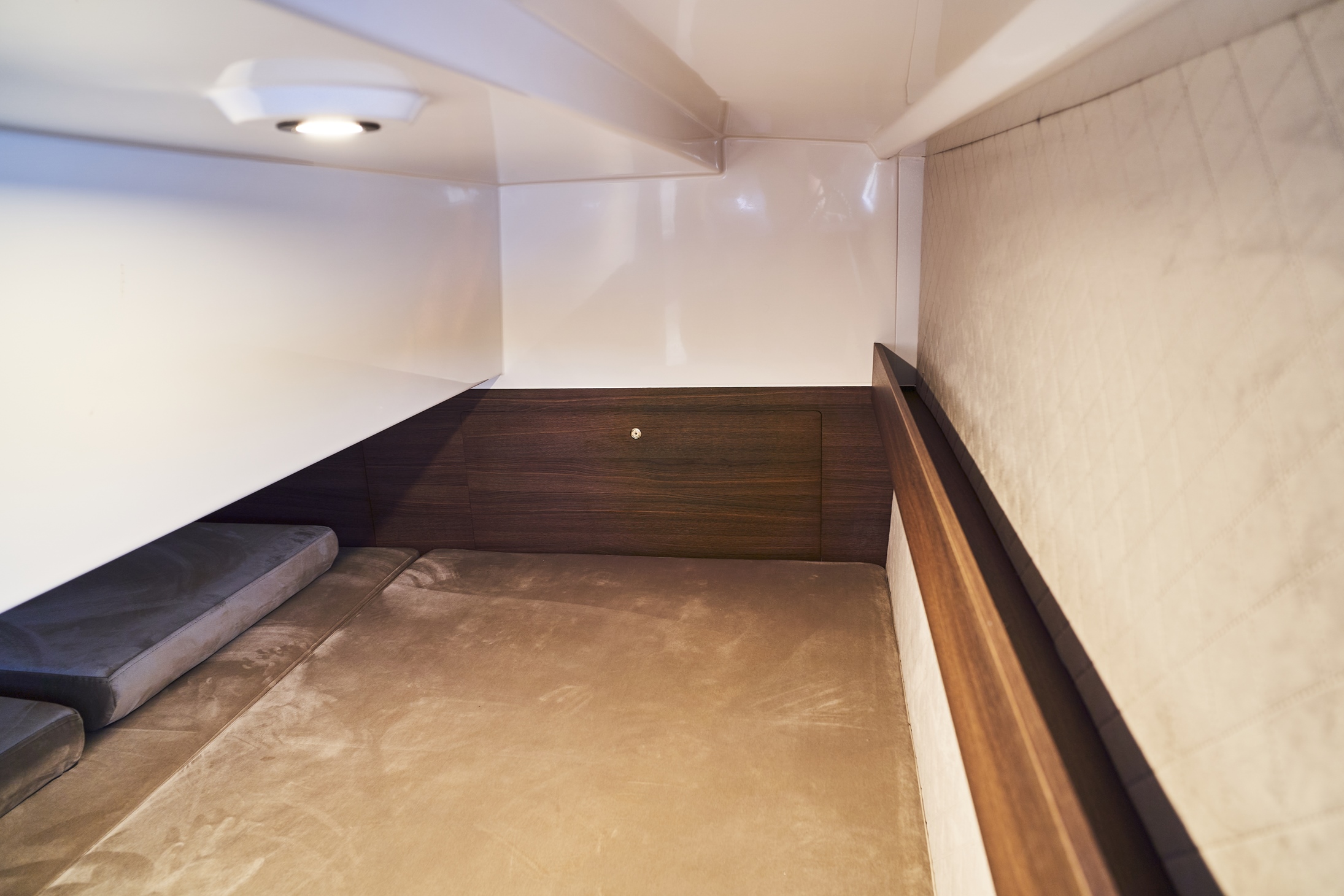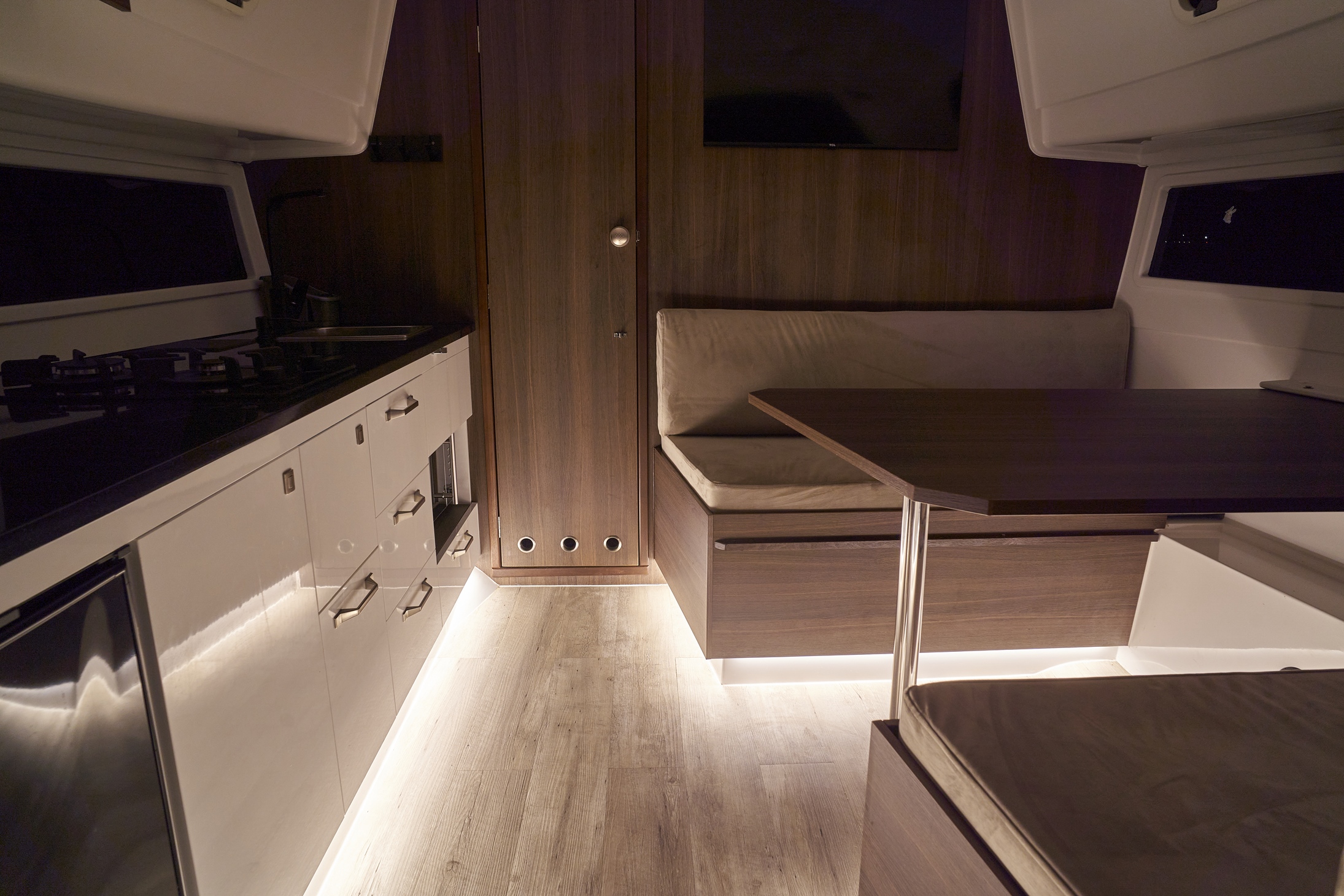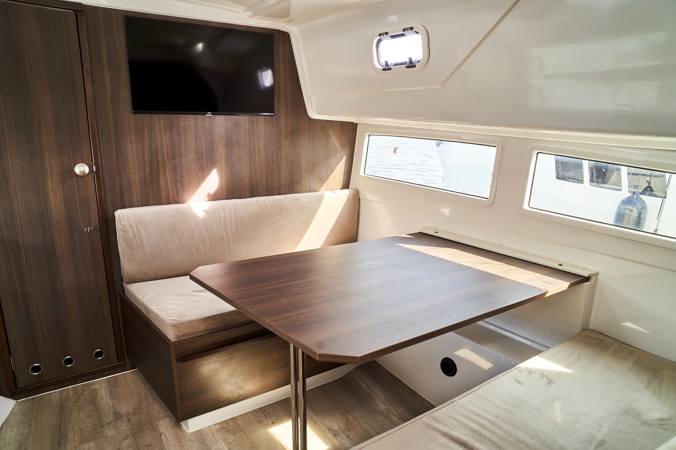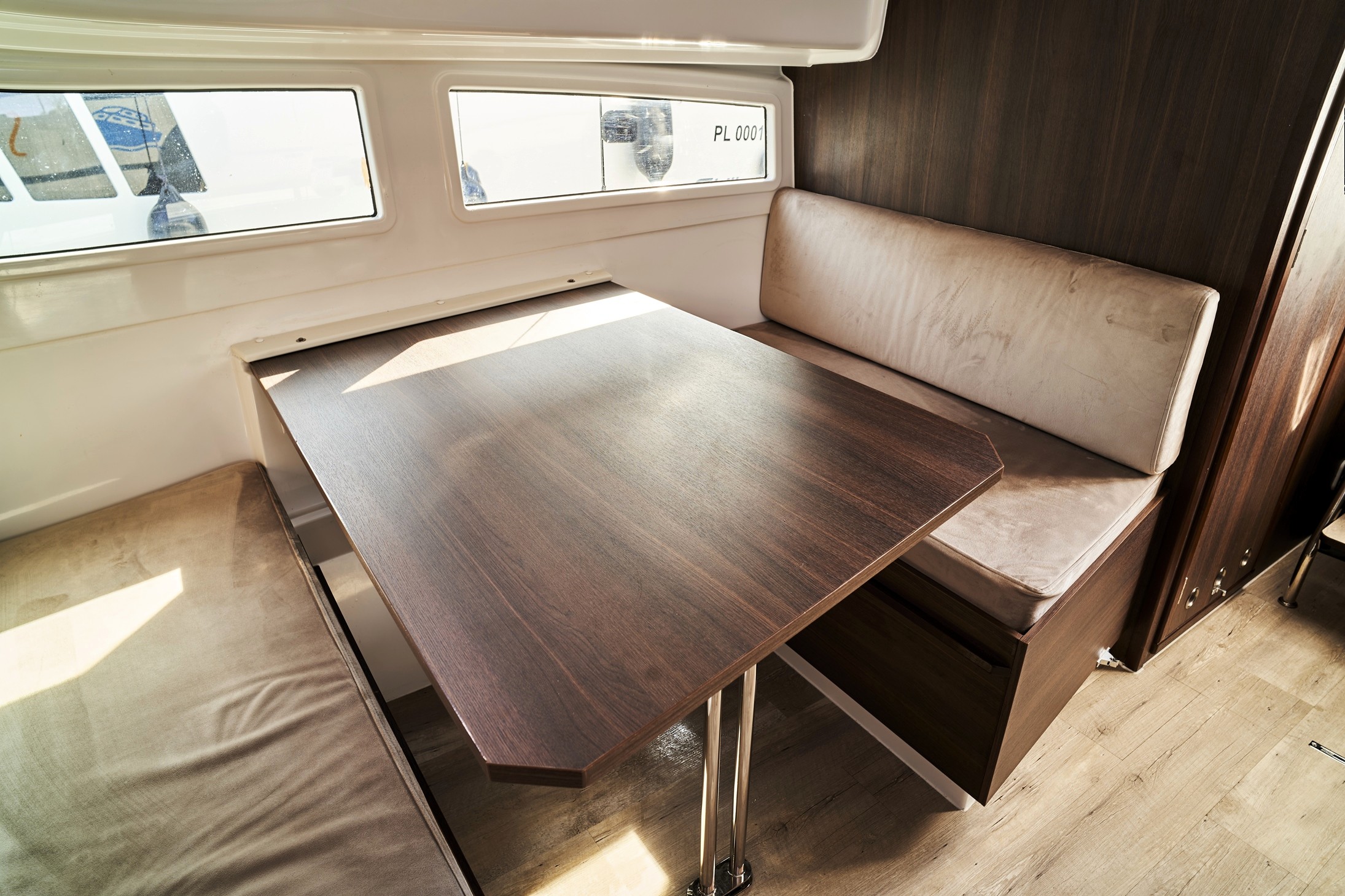Wnętrze jest dobrze doświetlone dzięki dużym oknom. Do dyspozycji są dwie zamykane kabiny – dziobowa o funkcjonalnym układzie oraz szeroka kabina rufowa zapewniająca wygodne miejsce do spania. Dodatkowe koje znajdują się w mesie, gdzie stół można przekształcić w miejsce do spania.