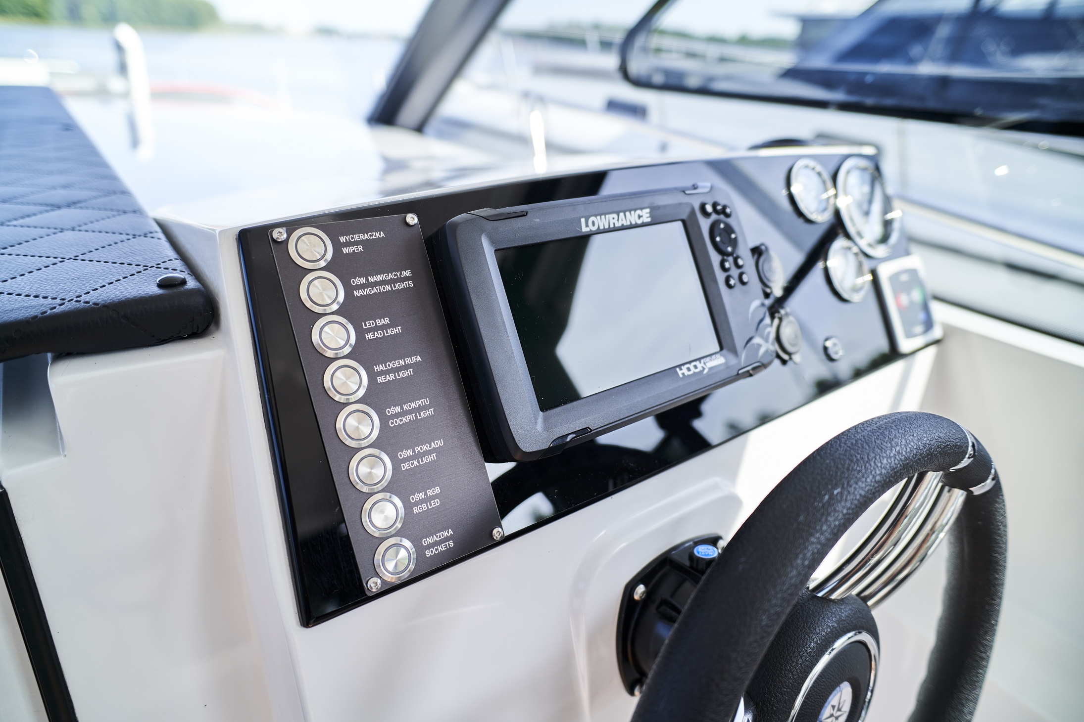 Koło sterowe, Ster strumieniowy dziobowy, Echosonda GPS z mapami jezior, Elektryczna winda kotwiczna, Nagłośnienie premium z 7 głośnikami (w tym subwoofer) w kokpicie, Panel fotowoltaiczny / solar dachowy, Przetwornica 230v – zasilane wszystkie gniazdka na jachcie w tym ekspres do kawy i kostkarka do lodu (z wyłączeniem kuchenki mikrofalowej), Gniazdka 230v w każdym pomieszczeniu, Akumulator hotelowy 110 ah x2 ładowany solarem dachowym oraz silnikiem, Akumulator steru strumieniowego 110 ah ładowany solarem dachowym oraz silnikiem, Odseparowany akumulator rozruchowy, Oświetlenie LED RGB w kokpicie (sterowane dźwiękiem), Ogrzewanie, Lodówka elektryczna kompresorowa z zamrażarką, Radio MP3, Bluetooth, TV Smart DVBT 30″, WC morskie zbiornik na fekalia, Oświetlenie elektryczne LED, Woda pitna, Ciepła woda, Prysznic z zimną i ciepłą wodą w łazience i na zewnątrz przy platformie kąpielowej, Gniazdo USB do ładowania telefonu komórkowego w każdym pomieszczeniu, Zlewozmywak z pompką elektryczną, Kuchenka gazowa, Kuchenka mikrofalowa, Kostkarka do lodu, Ciśnieniowy ekspres do kawy na kapsułki Tchibo, Komplet garnków, Komplet talerzy i sztućców, Butla z gazem, Gaśnica, Kamizelki ratunkowe, Koło ratunkowe, Drabinka zaburtowa, Relingi, Oświetlenie nawigacyjne, Stolik w kokpicie, Bosak, Dwie kotwice, Cumy, Obijacze, Wiadro, Mop, Środki czystości, Instalacja 12V i 230V z możliwością ładowania akumulatorów, Ubezpieczenie Jacht CASCO, OC, NW, ubezpieczenie silnika od kradzieży